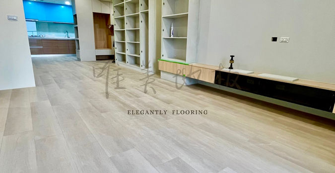 本案位於新北市板橋區,屋主新家採用SPC石塑地板5.5mm【伊利頓03】花色,整體色系以溫潤奶油淺木紋為基調,讓客廳與廚房的銜接空間更顯延伸感。